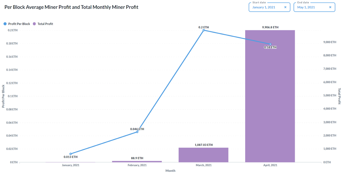 The total profit that miners have made from Flashbots increased nearly 10X in April from ~1k ETH to ~10k ETH of profit. At the same time the average profit per block has stabilized at 0.18–0.2 ETH per block. It is expected that Flashbots’ next release will increase both total profit and average profit per block.