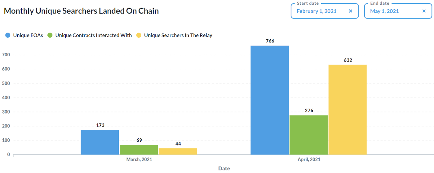 At the time of writing, mining pools accounting for more than 84% of the Ethereum network hash rate has adopted Flashbots, and the number of unique searchers who landed Flashbots bundles on chain has grown 1430% month on month to over 600 unique searchers in April. Maintaining software stability throughout the Ethereum Berlin Upgrade and improving core infrastructure has been a primary focus for Flashbots. In parallel, we finalized the spec for Flashbots Alpha v0.2, our 2nd major release of Flashbots, surveyed the community for technical feedback, and worked hard towards our release in May.